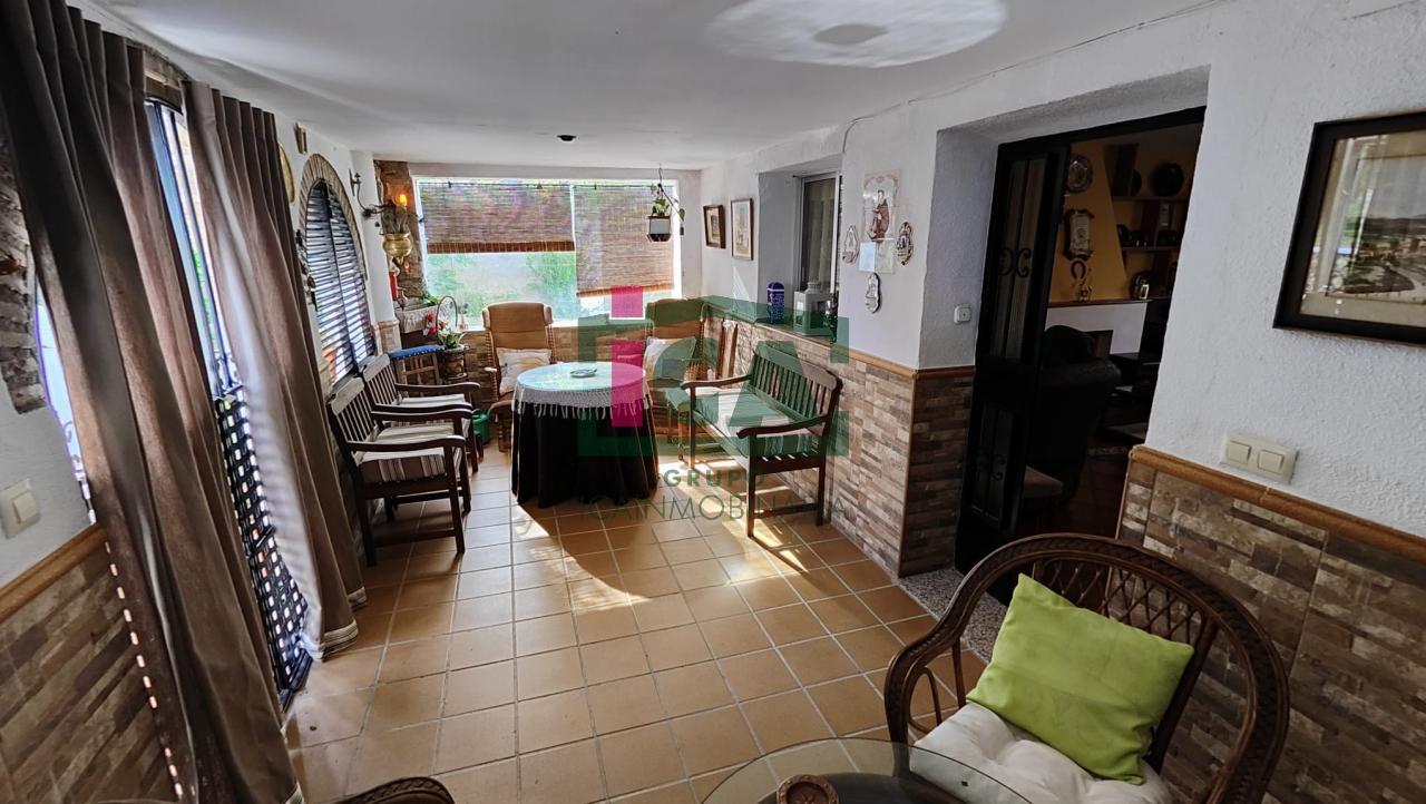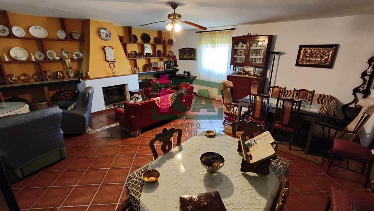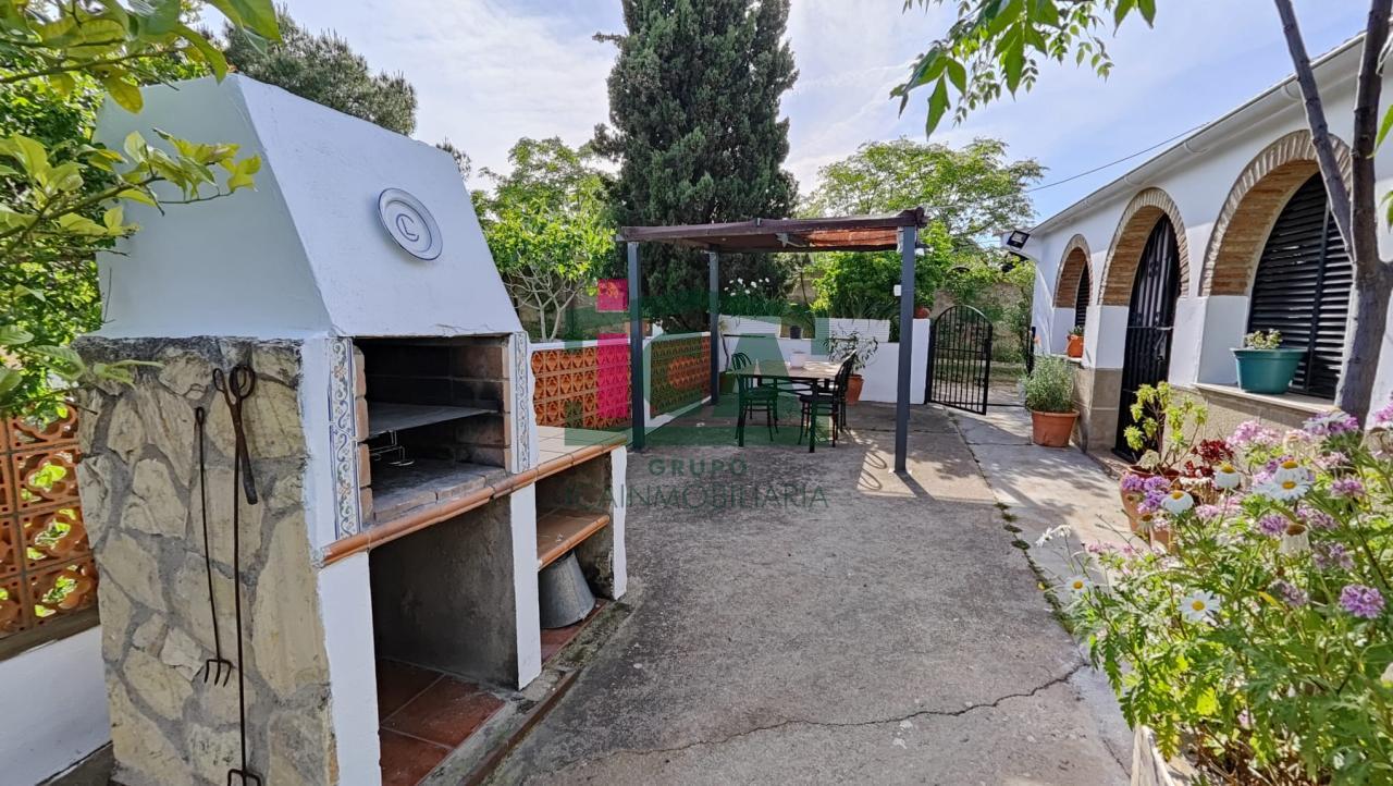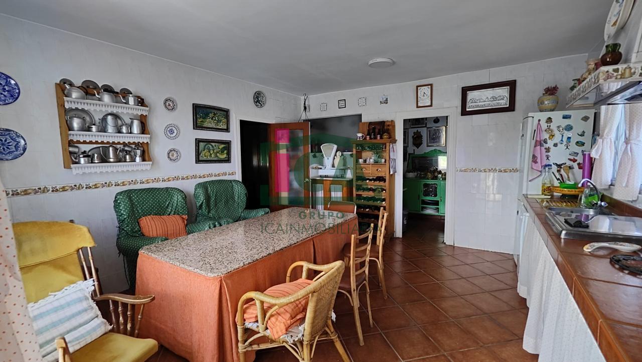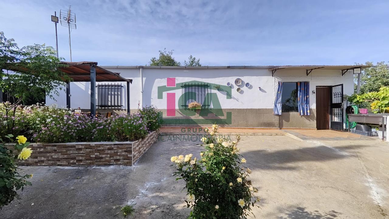 En cuanto a la vivienda tiene una superficie de unos 140 m2 aprox. todo en una sola planta, distribuida en porche cubierto de entrada con grandes ventanales, salón muy amplio con chimenea y ventilador de techo, cocina-comedor con gran despensa, 3 dormitorios todos con ventilador de techo y ventanas con mosquiteras, dos baños completos uno con bañera y otro con plato de ducha, buena carpintería, rejas en las ventanas, solados de gres rústico. Agua de red pública con su alcantarillado, además de pozo, luz eléctrica. Todo exterior y soleado.