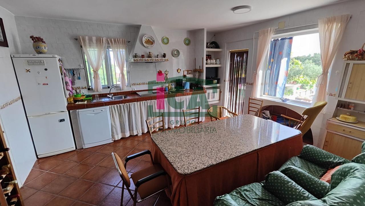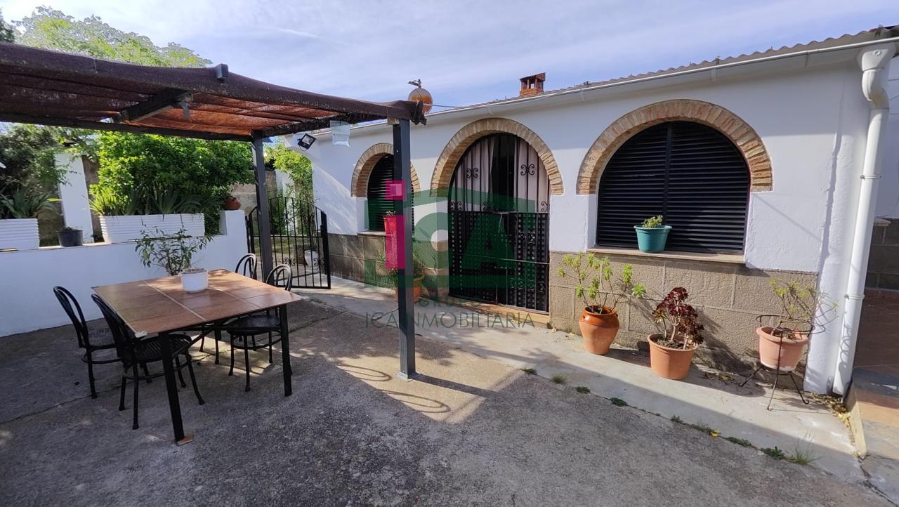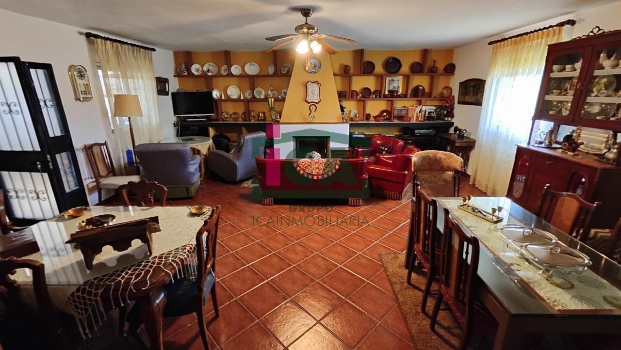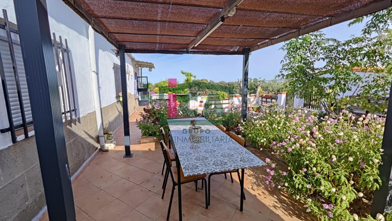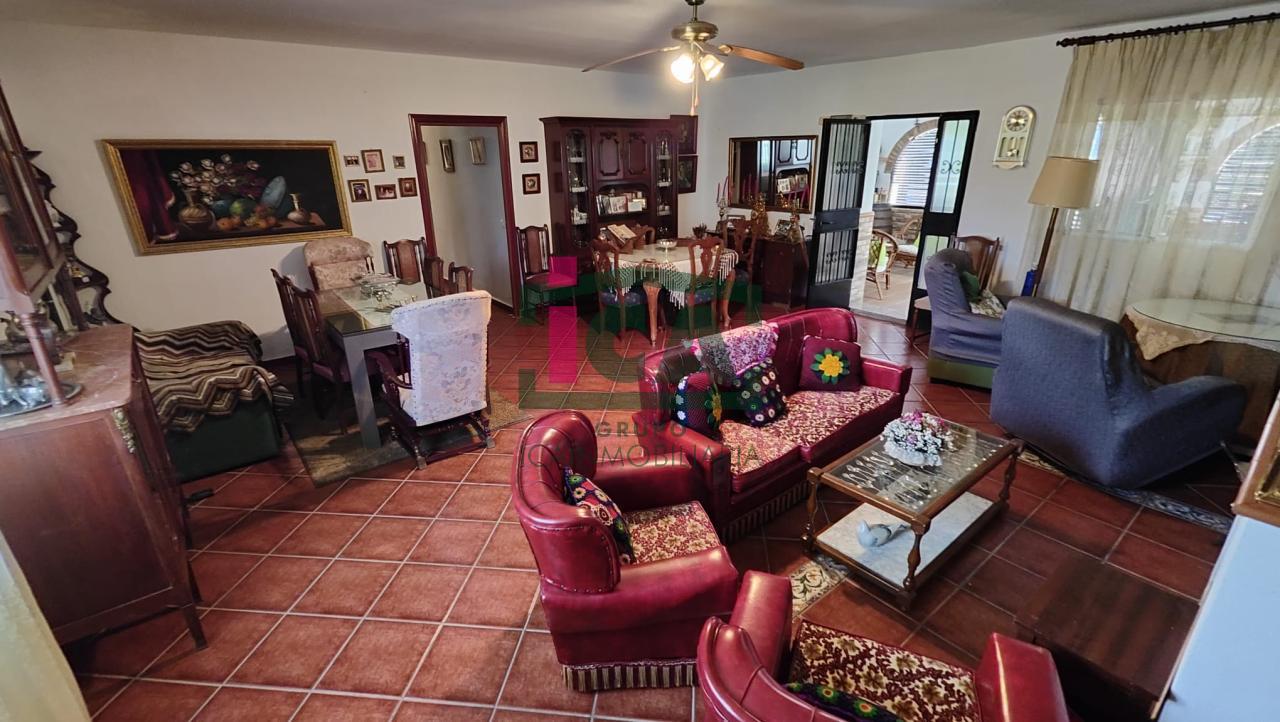 En cuanto a la vivienda tiene una superficie de unos 140 m2 aprox. todo en una sola planta, distribuida en porche cubierto de entrada con grandes ventanales, salón muy amplio con chimenea y ventilador de techo, cocina-comedor con gran despensa, 3 dormitorios todos con ventilador de techo y ventanas con mosquiteras, dos baños completos uno con bañera y otro con plato de ducha, buena carpintería, rejas en las ventanas, solados de gres rústico. Agua de red pública con su alcantarillado, además de pozo, luz eléctrica. Todo exterior y soleado.